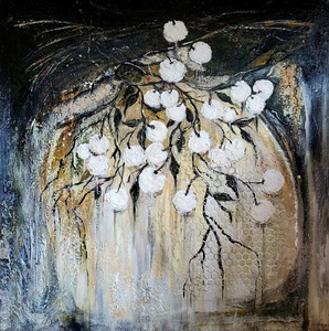 2023Mixedmedia op paneel (Acrylverf, krijtverf, relief en silverleaf)